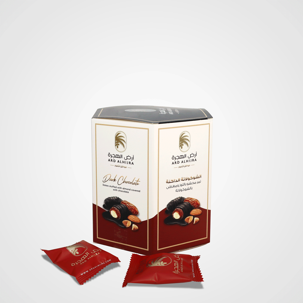 Dates stuffed with almonds and covered with dark chocolate provide a delicious experience that combines the sweetness of dates with the flavor of roasted almonds and rich dark chocolate. It is a great choice for lovers of luxurious and distinctive sweets.