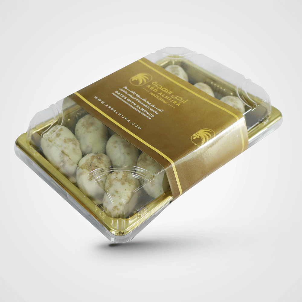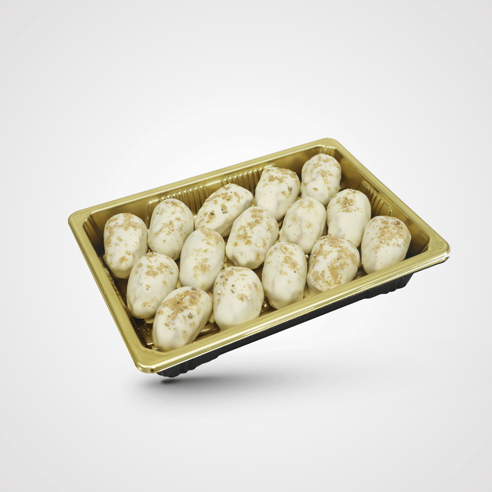 Dates stuffed with almonds covered with white chocolate and cardamom, combining the sweetness of dates and almond flavor with a luxurious touch of cardamom. Delicate chocolate packaging adds extra deliciousness to an irresistible experience for sweets lovers.